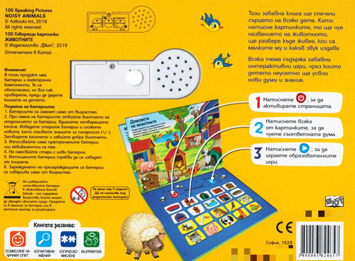 Тази забавна книга ще спечели сърцето на всяко дете. Като натисне картинките, то ще чуе названието на животното, ще разбере къде живее, кои са малките му и какъв звук издава.