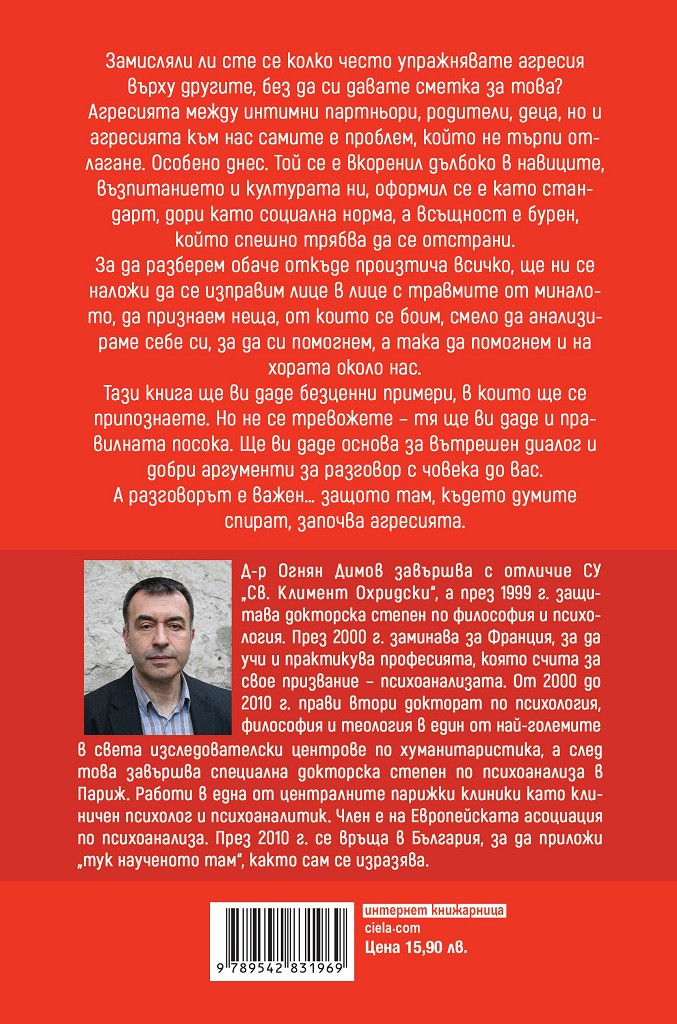 За да разберем обаче откъде произтича всичко, ще ни се наложи да се изправим лице в лице с травмите от миналото, да признаем неща, от които се боим, смело да анализираме себе си, за да си помогнем, а така да помогнем и на хората около нас.Тази книга ще ви даде безценни примери, в които ще се припознаете. Но не се тревожете – тя ще ви даде и правилната посока. Ще ви даде основа за вътрешен диалог и добри аргументи за разговор с човека до вас.А разговорът е важен… защото там, където думите спират, започва агресията.