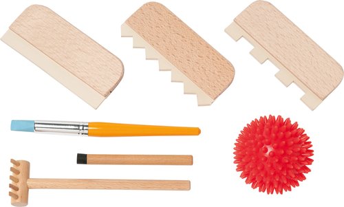 Съдържание / материали / размери: 1 бодлива топка, 2 четки за рисуване с дълга дръжка, 1 дървено валяче, 3 различни гребла без дръжка, 1 гребло за почистване, листовка с инструкции.