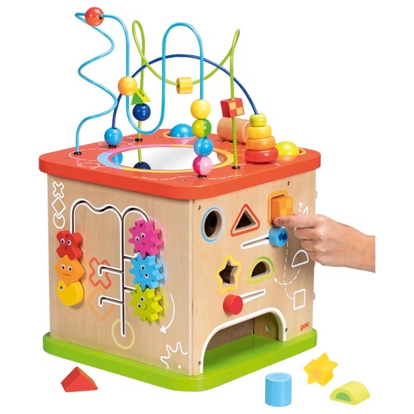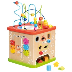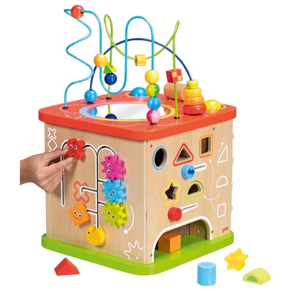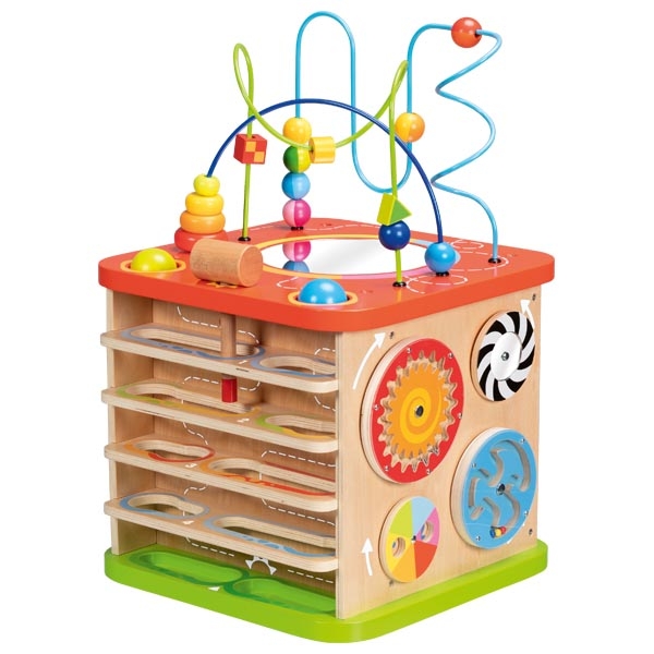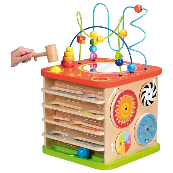 Активен куб Моторика – голям е многофункционална образователна игра, която предлага богати възможности за игра и откриване още от най-ранна възраст. Всяка страна на куба е оборудвана с различни активности, които стимулират любопитството, фината моторика и когнитивното развитие на детето. Комбинацията от сортери за форми, лабиринти с мъниста, въртящи се зъбни колела и звукови елементи превръща играта в цялостно сензорно преживяване. Изработен от висококачествени и устойчиви материали, кубът е подходящ за интензивна и дълготрайна употреба.