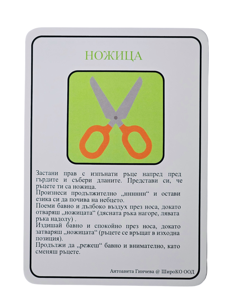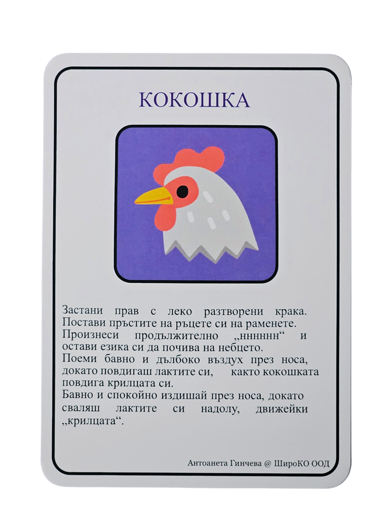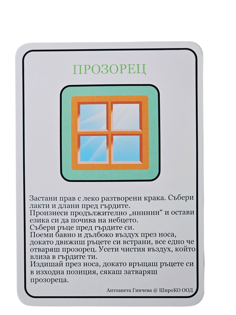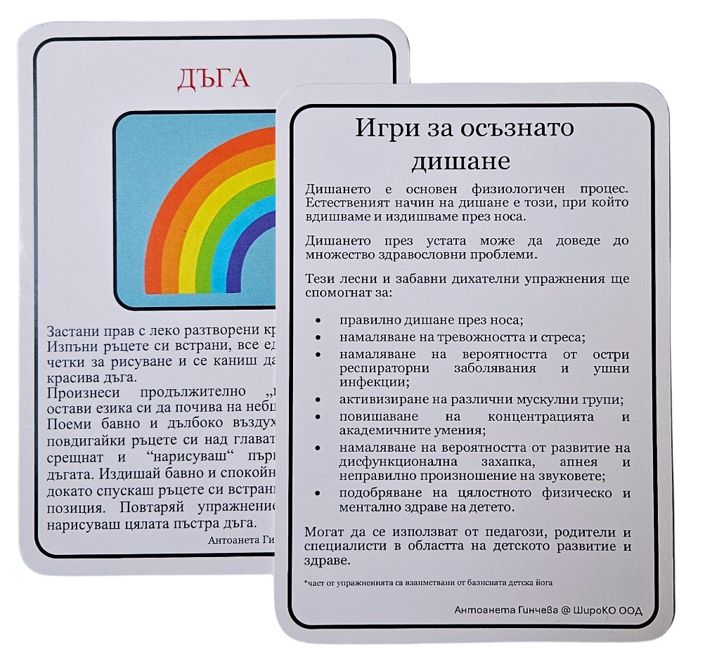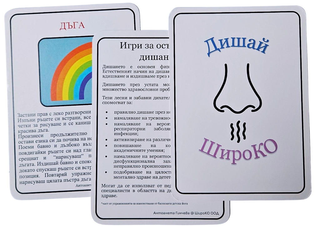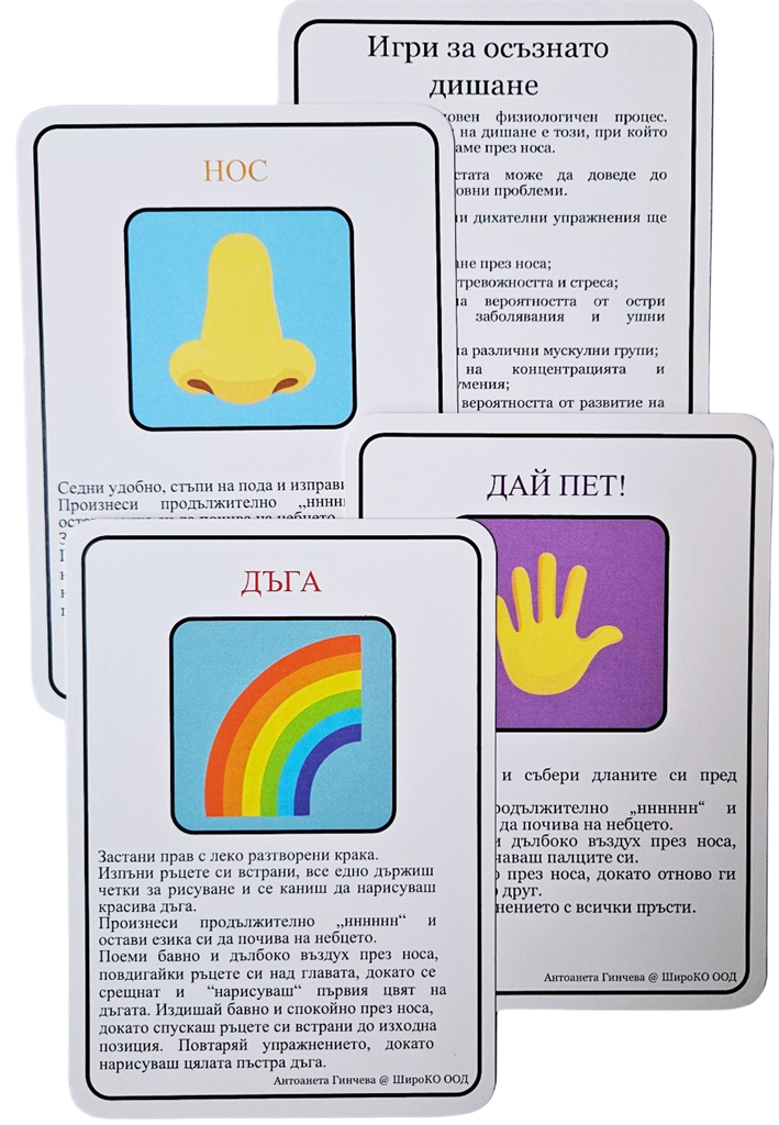 Комплект с 28 цветни карти с лесни и забавни дихателни упражнения.