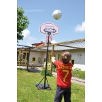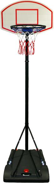 Подвижен баскетболен кош с реголируема височина от 165 до 205 см. Здрава пластмасова основа с колелца, която може да се пълни с пясък или вода за по-голяма стабилност. Баскетболно табло с размери 75 х 54 см, изработено от здрава пластмаса със стоманен пръстен с прахово покритие Ø 43 см. Метална стойка.