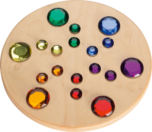 Съдържание / материали: 1 въртящ се диск от брезов шперплат, боядисан и лакиран, с вградени ‘скъпоценни’ камъни от пластмаса