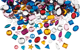Декоративни камъчета за лепене, изработени от пластмаса в различни форми, размери и цветове. Опаковка около 250 гр. с 400 бр. Размери: Ø 0,5–3 см