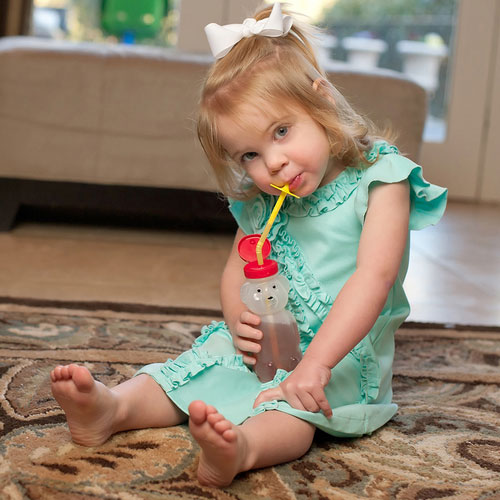 В комплекта е включена уникална клапа, която контролира потока на течността. След всмукване тя остава в сламката, а не изтича обратно в бутилката. За целта просто натиснете коремчето на мечето, докато течността се качи до необходимата височина в сламката и освободете. Течността ще остане в сламката и така ще се намали усилието при пиене. Бутилката е подходяща за хора, които са склонни да аспирират поетата течност или имат трудности със започването и поддържане на засмукването.