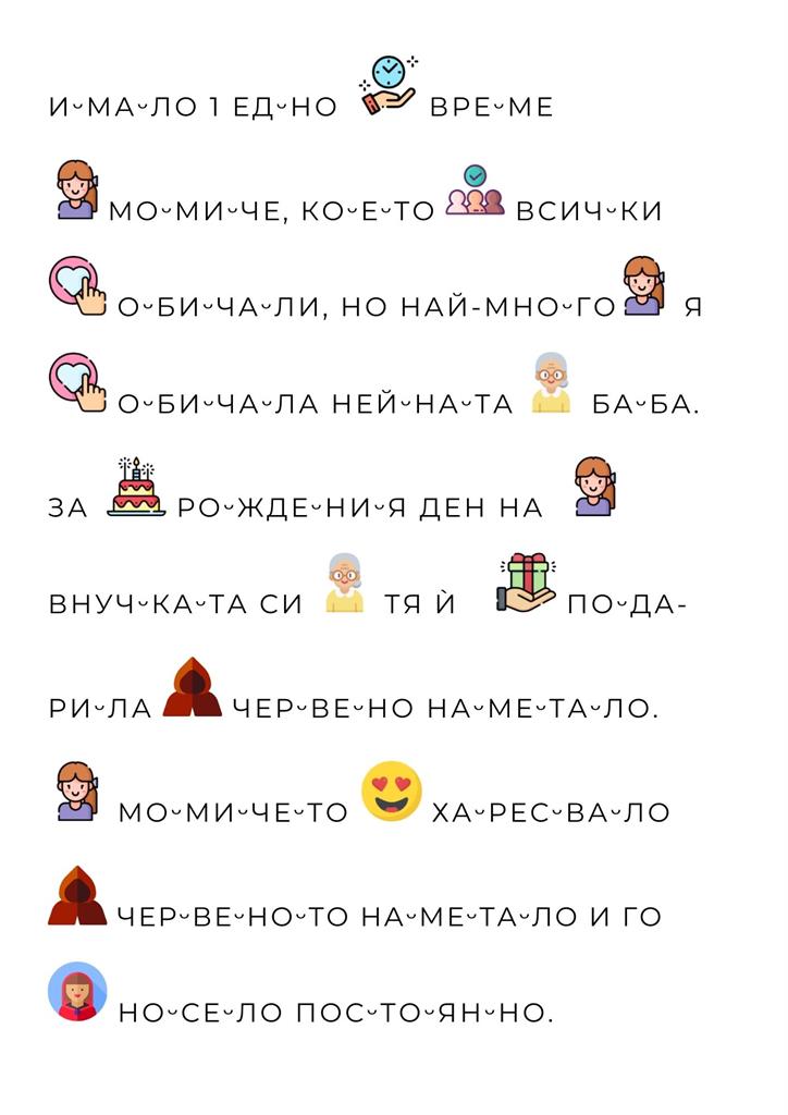 Първа част – Приказката е представена с думи, разделени на срички, допълнени от пиктограми, които помагат на децата да разберат значението на всяка дума.