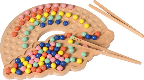 Забавна игра с цветни топчета и пинсети за сортиране, подреждане, развитие на фината моторика и координацията ръка-око. Децата могат да подредят топчета върху дървената табла във формата на дъга или в свободни цветови комбинации.