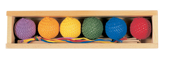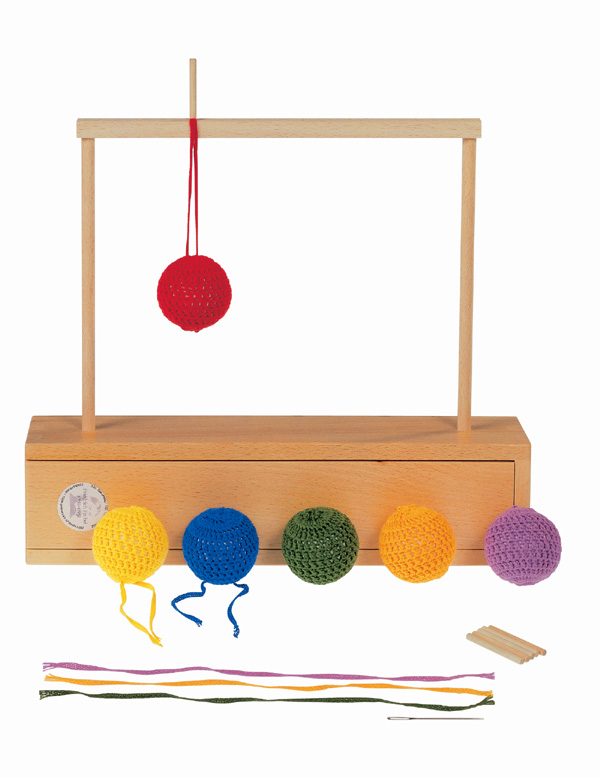 Съдържание/ материали / размери: 6 топки с диаметър 4 см, оплетени с прежда в цветовете на дъгата с 6 цветни връзки за окачване, 1 игла, рамка и пръчки. Доставя се в дървена кутия с плъзгащ се капак.
