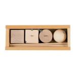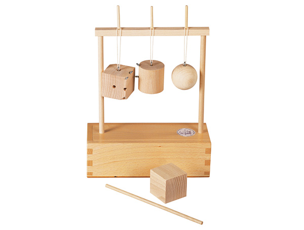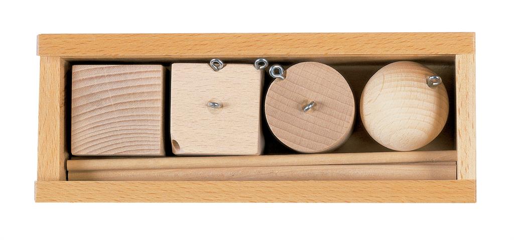 Съдържание/ материали: топка, цилиндър и куб с халки за закачане и дупки за поставяне на пръчки; 1 куб, рамка, пръчки, връзки. Доставя се в дървена кутия с плъзгащ се капак.