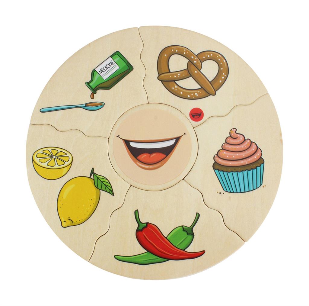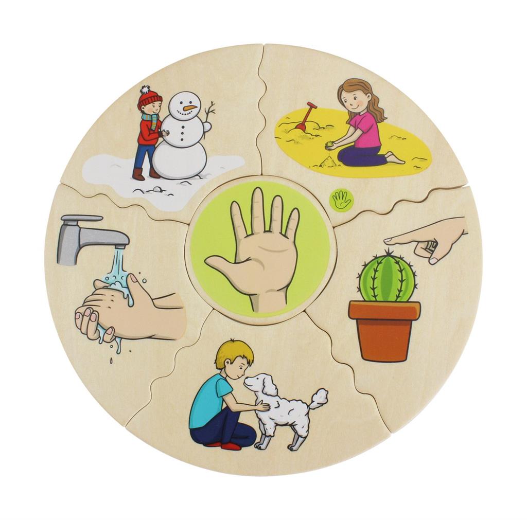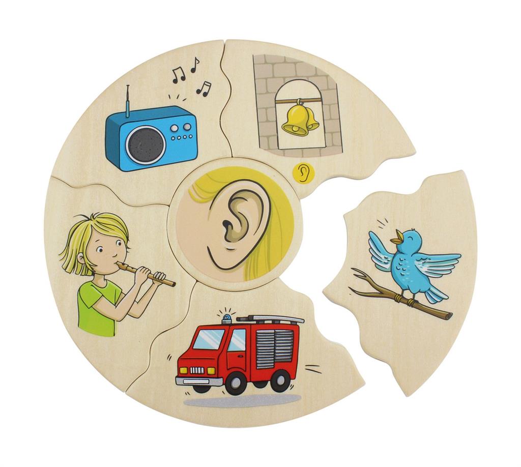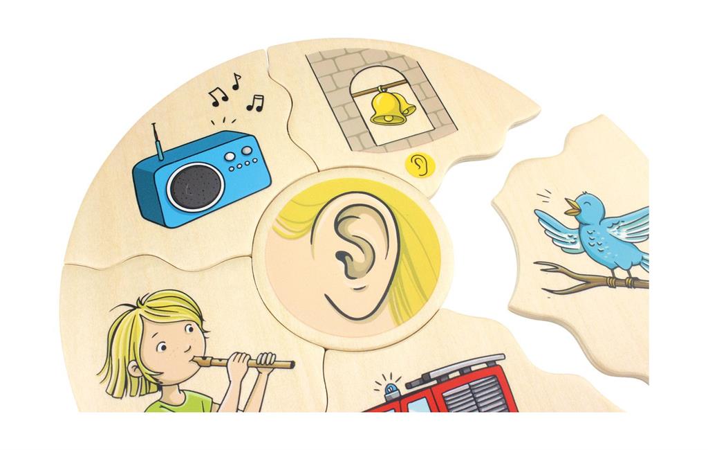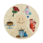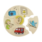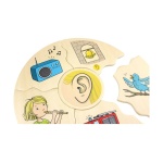 Заниманията с детски дървен пъзел „Хуманико 5 сетива“ ще стимулират у детето способност за разпознаване и разбиране на петте сетива (зрение, слух, вкус, обоняние и допир), а правилното подреждане на елементите ще усъвършенства фината му моторика и координацията око-ръка.
