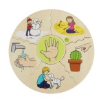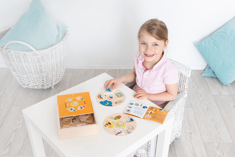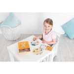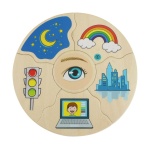 Детският пъзел е изработен от висококачествени материали, дизайнерски е решен с артистични картинки в атрактивна цветова гама и се доставя в компактна дървена кутия за лесно съхранение.