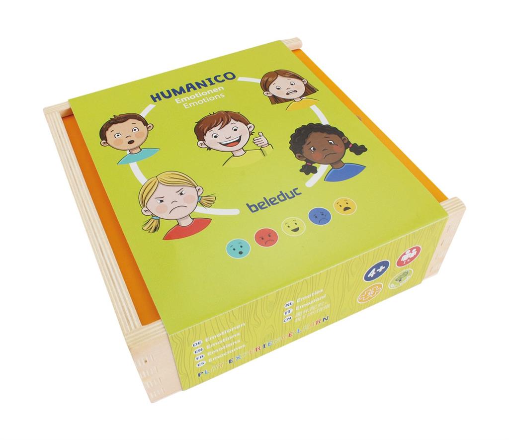 Заниманията с дървен пъзел „Хуманико Емоции“ ще стимулират у детето умение за разпознаване и разбиране на различни чувства (страх, тъга, гняв, изненада и щастие), ще развият езиковите, комуникативните и социалните му умения, ще насърчат себевъзприятието му и склонността да споделя. Правилното подреждане на елементите ще усъвършенства фината му моторика и координацията око-ръка.