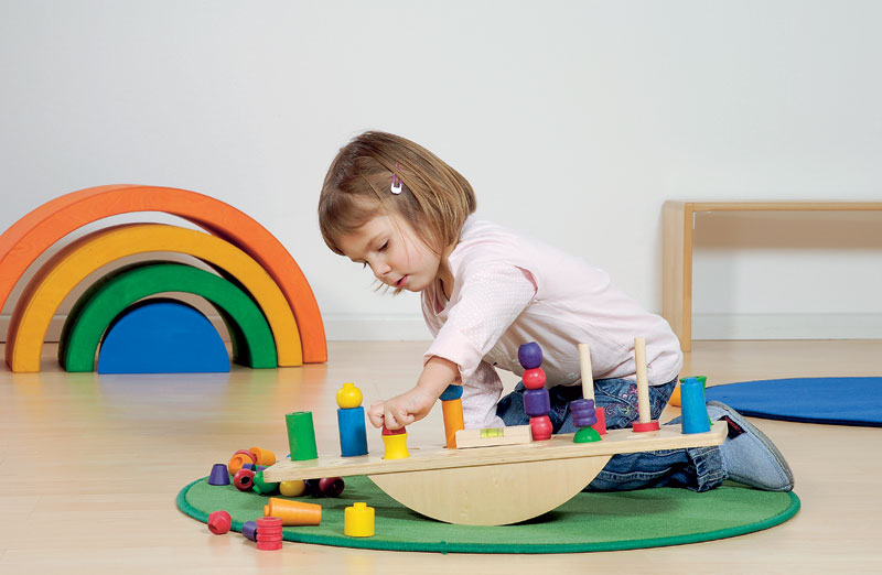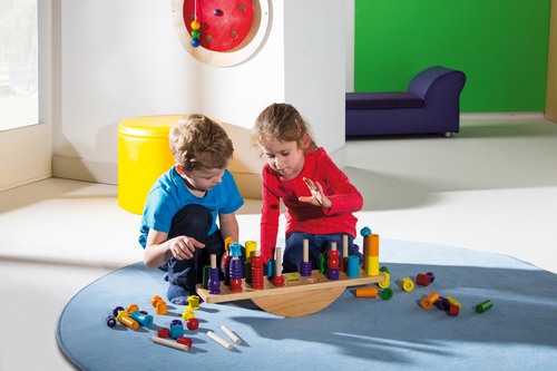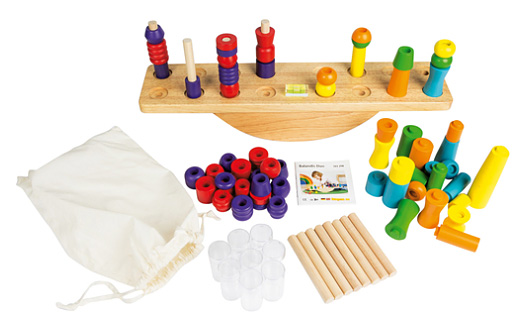 Кой ще успее да балансира дъската? Целта на играта е да се балансира дъската, като се поставят мъниста и пулове върху нея. Играчите могат да използват всички елементи. Мънистата се нанизват върху пръчките, а пуловете се поставят в прорязаните гнезда на дъската. Играта запознава децата с понятията за размер и тегло по един забавен начин. Те откриват, че разположението на елементите върху дъската е най-важното условие за успех в играта… Нивелирът може да се използва, за да се провери нивото на баланс.