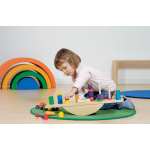 Съдържание / материали / размери: Дървена дъска с 16 прореза (55,5х12,5х9,5 см), 32 пула и 32 мъниста за нанизване с различни форми и цветове, 12 дървени пръчки (диаметър 3,5 см х височина 1,5–6 см), 1 дървен нивелир (7 х 2 х 2 см)