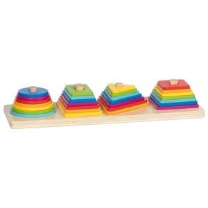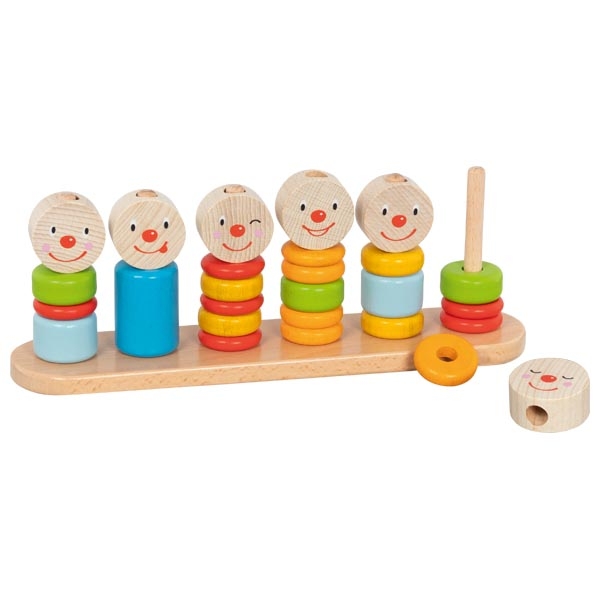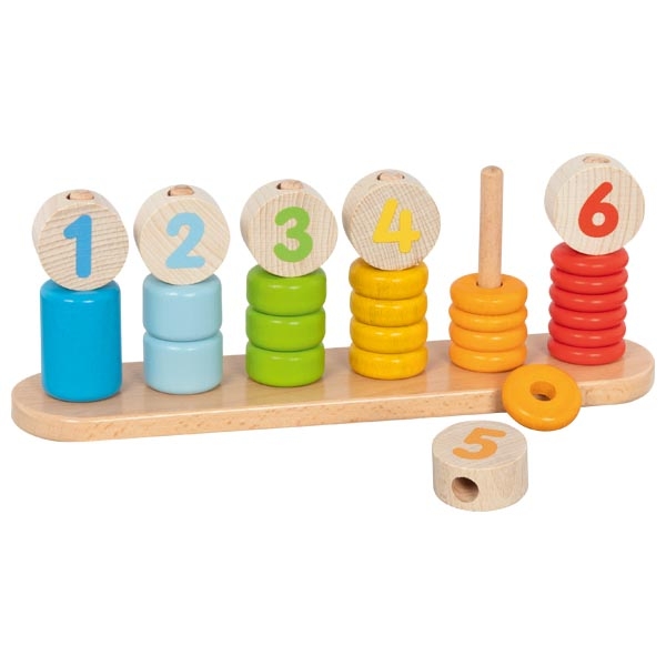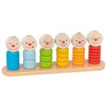 Съдържание: Дървена основа, цветни пръстени за нанизване, дървени фигурки с цифри и лица