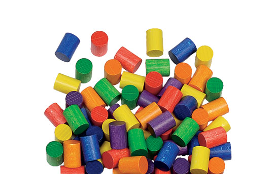 Опаковка от 100 бр. дървени елемента с цилиндрична форма, с еднакна големина, но в различни цветове. Подходящо за игри с броене и сортиране по цветове. Може да се използва в комбинация с табла за вгнездаване (141601).