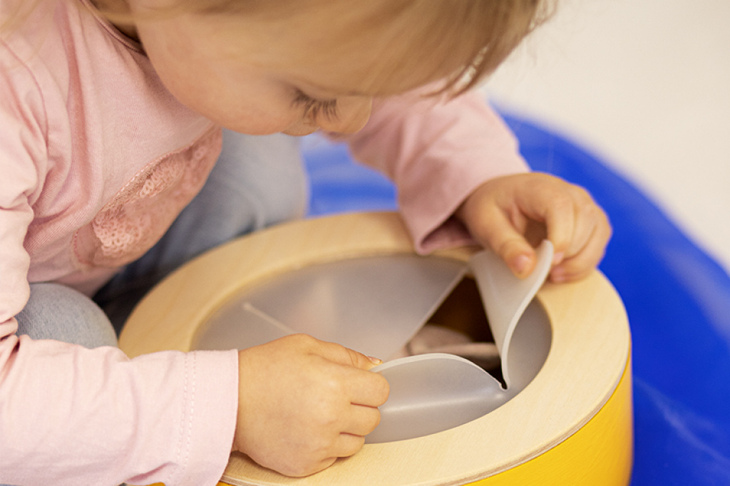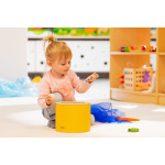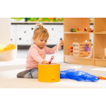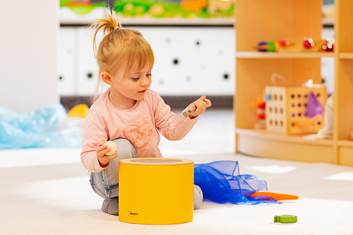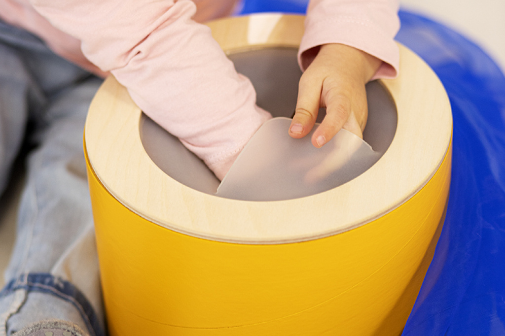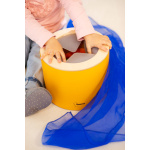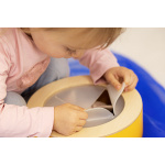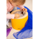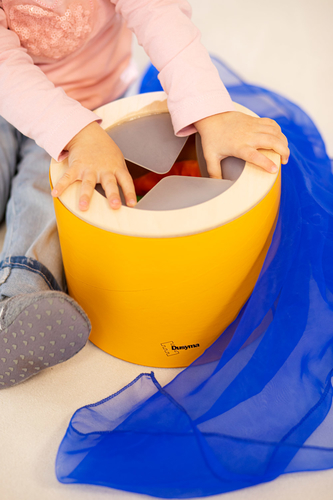 Пускаш нещо в кутията и то изчезва. Дали наистина е така? Вълшебната кутия е вълнуващ игрален материал за малките изследователи, които опознават постоянството на обектите. Благодарение на силиконовите капаци ръката на детето може лесно да бръкне в кутията и да опипа скрития предмет. Отворът е достатъчно голям, за да може кутията да се напълни с голямо разнообразие от сензорни материали като шалове, природни материали, топчета, малки играчки и какво ли още не.