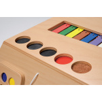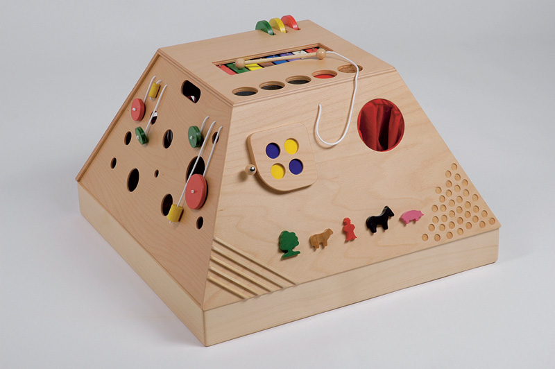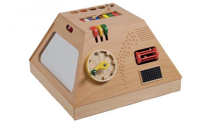 Страна 2: Въртящо се колело с метални пластини, издаващи звук; въртящо се дървено колело със звънче; отвори за трениране захвата на ръката; 3 въртящи се дървени колела; изпъкнала релефна плочка