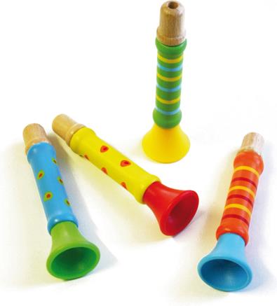 Детска свирка тромпет в свежи и весели цветове. Материал: пластмаса, дърво Размери: диам. 3 см, дължина 12 см Цветове: различни Цената е за 1 брой.
