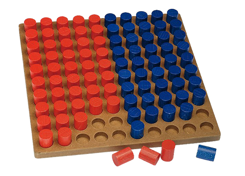 Дървена табла от MDF със 100 отвора и 100 дървени дюбелчета в червено и синьо (по 50 бр. от всеки цвят).