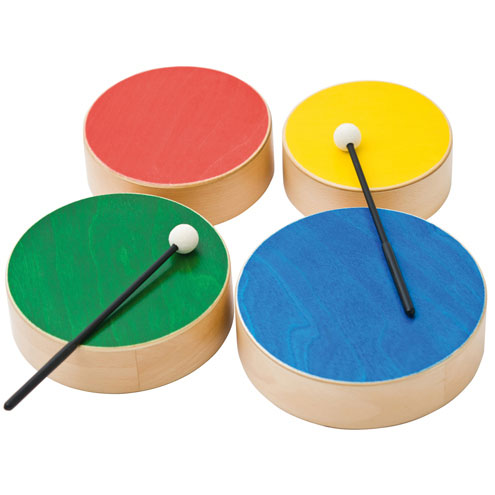 Комплект цветни дървени барабани, които могат да се подреждат един в друг. Всеки барабан издава различен звук Съдържание / материал: 4 барабана от букова дървесина, 2 палки Размери: диам. 16, 18, 20 и 22 см