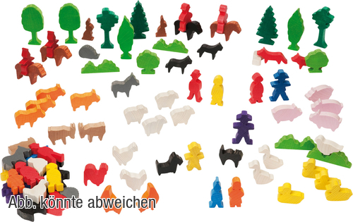 Съдържание / материали / размери: Комплект дървени цветни фигурки на домашни животни, хора, храсти и дървета – около 84 фигурки в найлонова торбичка.