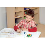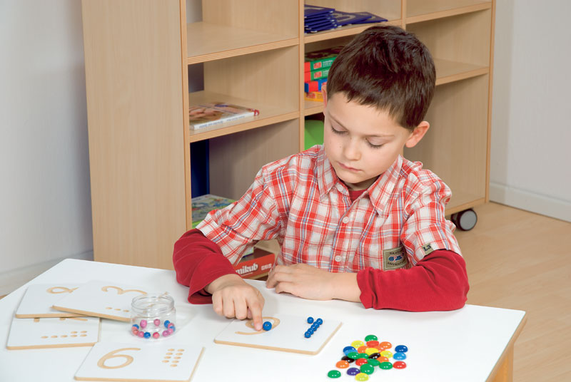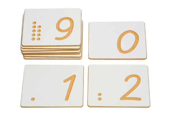 Опознайте формата на цифрите чрез докосване. Гравираните точки към всяка цифра помагат за формирането на количествени представи. За да направите играта по-интересна и творческа, може да запълвате контурите на цифрите с цветни мъниста или да правите „отливки“ от пластелин.