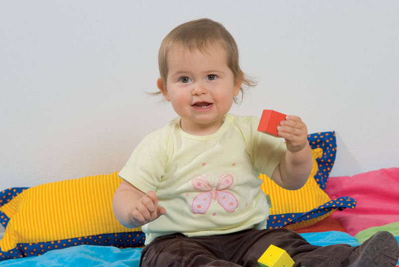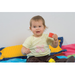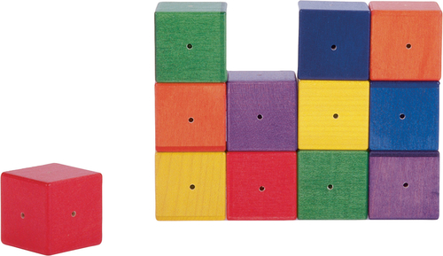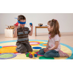 Съдържание / материали / размери: 6 двойки цветни кубчета (4х4 см), като всяка двойка издава различен звук при разклащане. Съхраняват се в торбичка от плат с шнур.