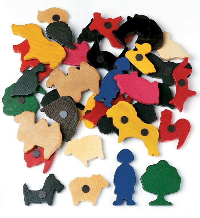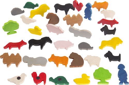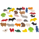 Съдържание / материали / размери: Комплект от 34 дървени фигури на животни с магнит на гърба. 17 различни форми. Дебелина 0,8 мм. Размери: хипопотам – 8х4 см. Опаковка – найлонова торбичка. Големината на фигурите е съобразена с малките детски ръце.