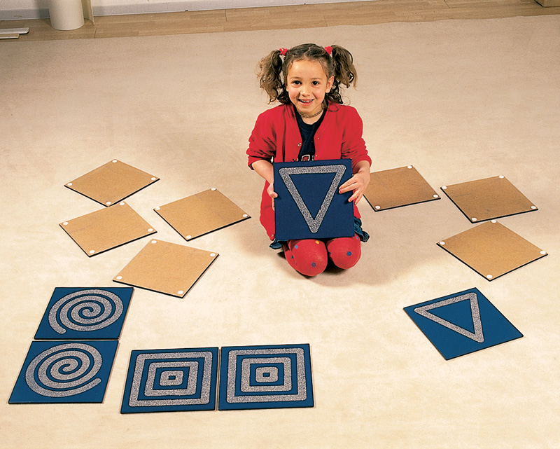 Предложения за игра: С плочките може да играете на различни игри за тактилни възприятия, съобразени с възрастта и възможностите на децата. Една от възможните дейности се нарича ‘Докосни, почувствай, нарисувай’. Затворете очи и докоснете с пръсти формите, отпечатани върху плочките, или ходете с голи крака върху тях. Опитайте да пресъздадете формите върху хартия или пясък, въз основа на тактилните си възприятия. Пясъкът е отлична среда за рисуване и усвояване на основните геометрични форми.