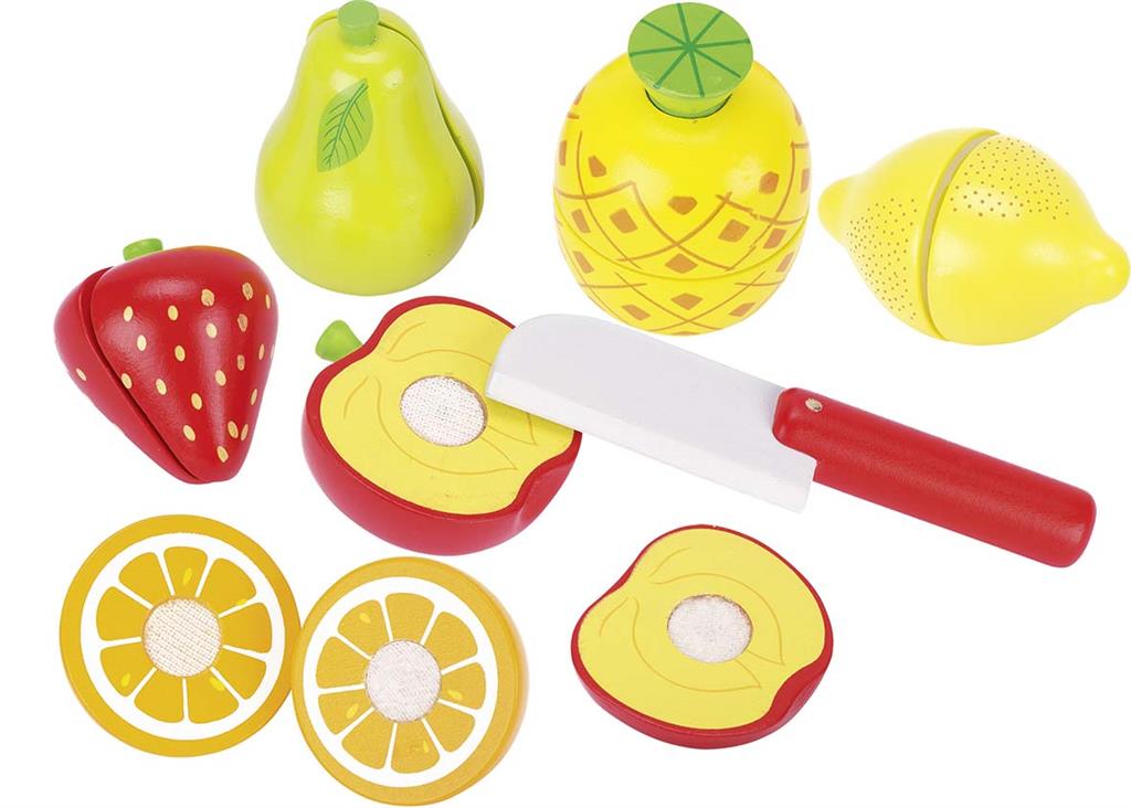 Детски комплект за упражняване на рязането с нож. Включва дървени макети на 6 различни плода, които могат да се разрязват на части (свързани с велкро).