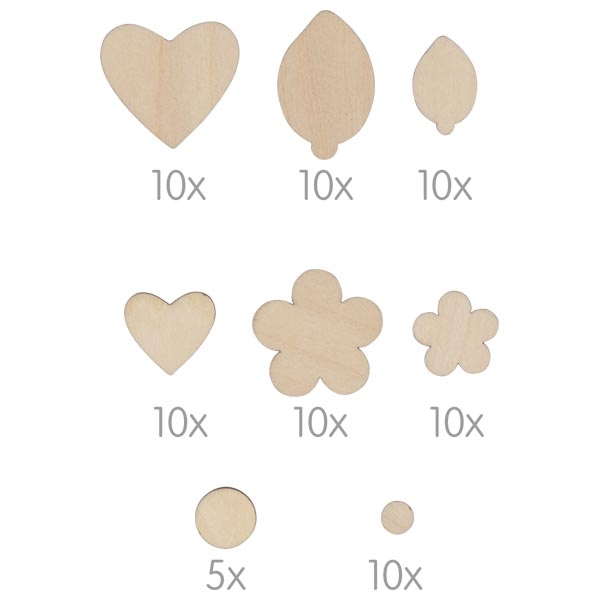 Комплект дървени плочки за декорация, апликации и конструктивни игри. Могат да се оцветяват, боядисват, лепят (напр. една върху друга). Децата могат да създават цели светове от цветя, листа или малки сърца.
