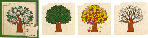 Многослоен пъзел. Всеки слой (с 9 части) показва дървото в различен сезон