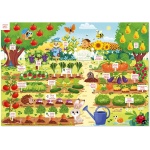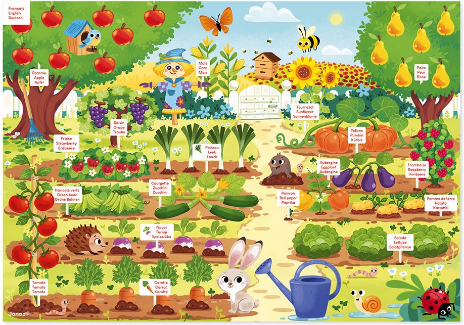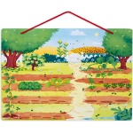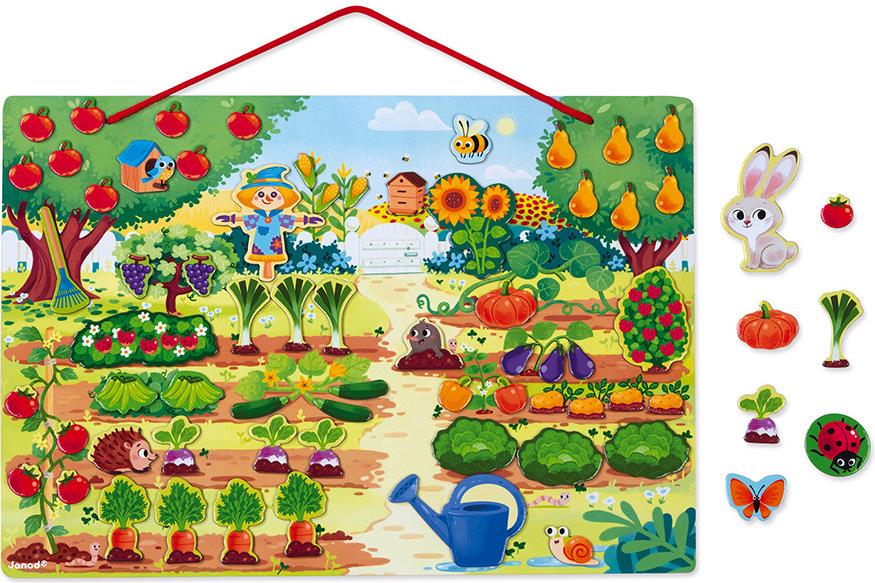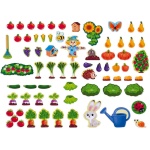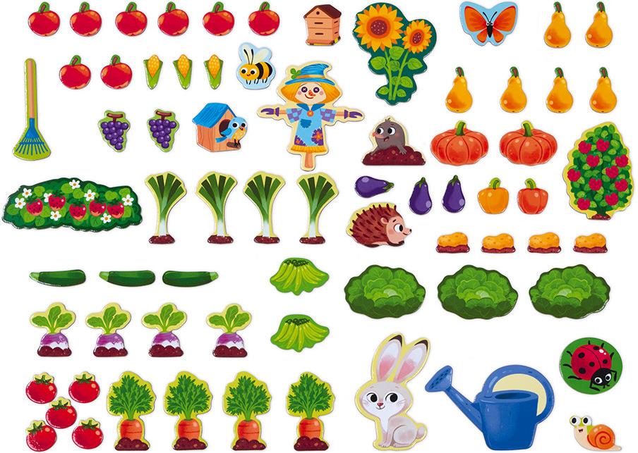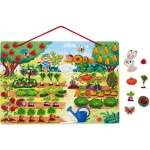Дървена магнитна дъска за окачване във вид на зеленчукова градина. Допълнена със 70 магнита – плодове, зеленчуци, инструменти, животни и др. Включен е двустранен образователен плакат на 6 езика.