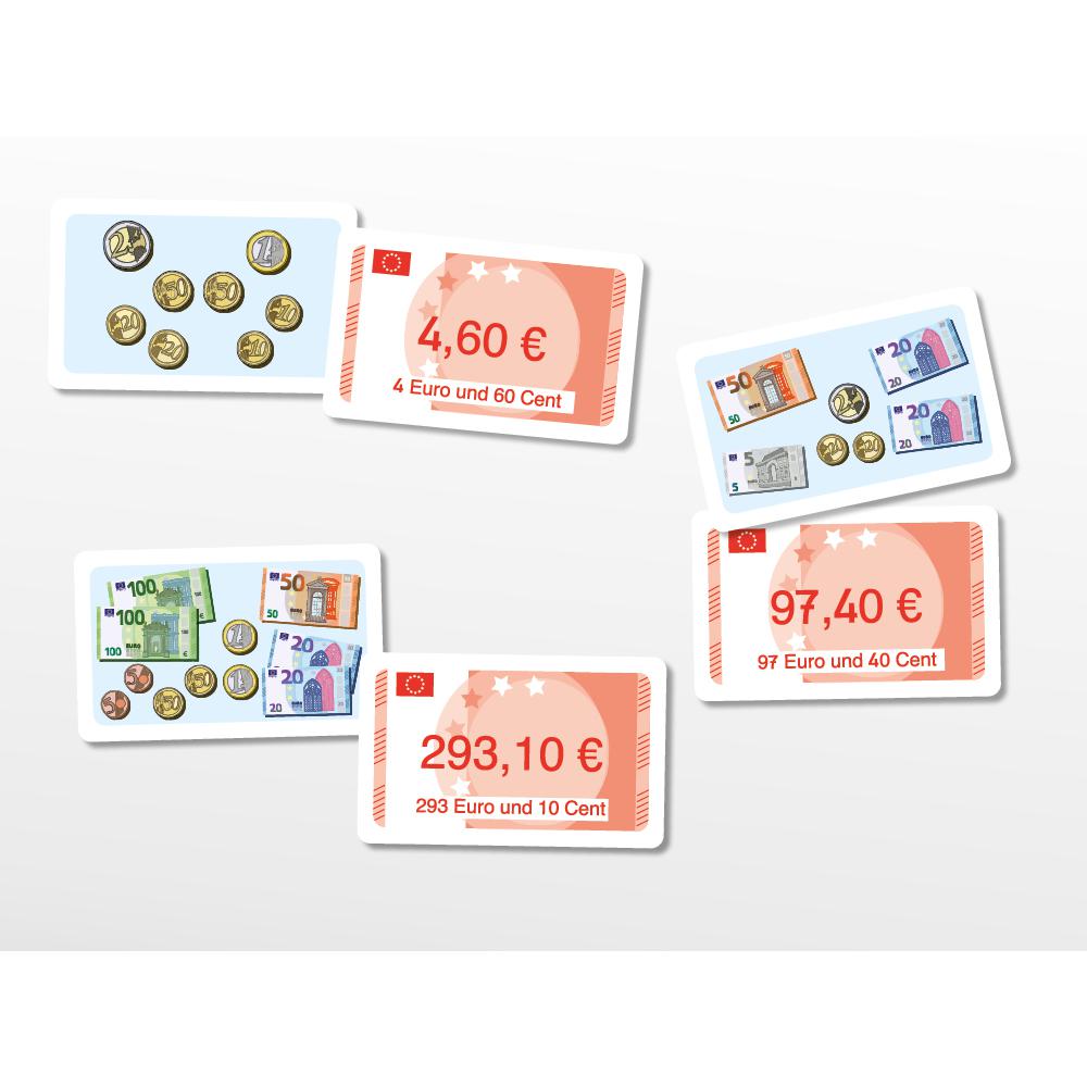 Картите се разбъркват хубаво и се разпределят между участниците по равно (поставени с картинките нагоре). Първият играч взима най-горната карта от своята купчинка, събира цифровите еквиваленти на изобразените банкноти и монети и назовава на глас общата сума. За да провери отговора си, обръща картата, сравнява с показаното число и я поставя в средата на масата. Ред е последователно на следващите участници. Играчът, чиято карта е с най-голяма сума, прибира картите от този кръг.