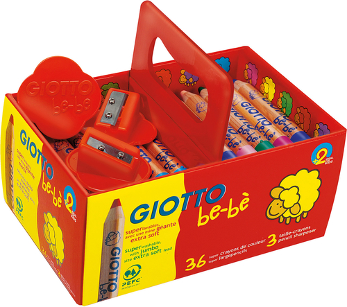 Комплект от 36 дебели молива в 12 различни цвята в практична кошница с дръжка. Моливите са предназначени за деца на възраст над 2 години. Дебелината им е съобразена с все още неумелата детска ръчичка, която се учи да хваща правилно молив и да рисува. Всеки молив има неподвижен мек накрайник, тъй като много деца обичат за захапват и дъвчат моливите и по този начин се предотвратява попадането на дървесни частици в устата. Следите от моливите лесно се почистват при случайно надраскване на дрехите. Включени са и 3 острилки с подходящ диаметър