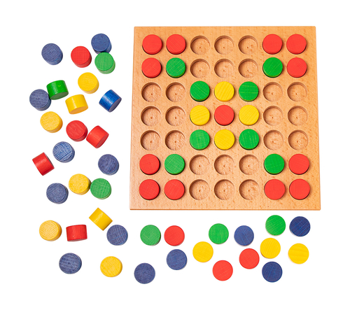 Съдържание / материали / размери: – 1 дървена табла 17х17 см с 49 отвора с диам. 18 мм – 63 дървени елемента с диам. 18 мм и височина 12 мм в жълто, синьо, зелено, червено – в картонена кутия 24x18x4 см