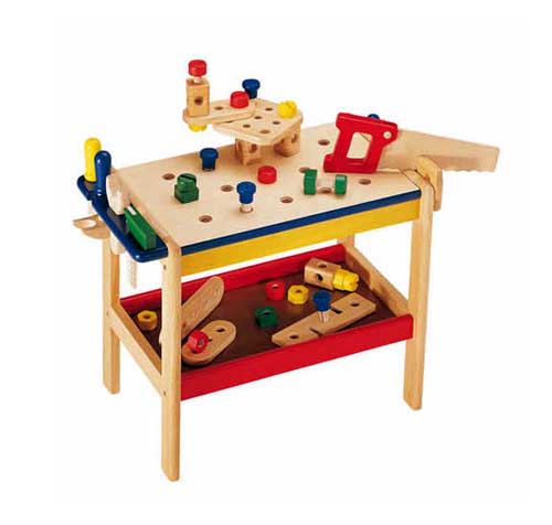 Съдържание / материали: Детска работна маса, 5 инструмента, 32 малки части, всички изработени от масивна дървесина