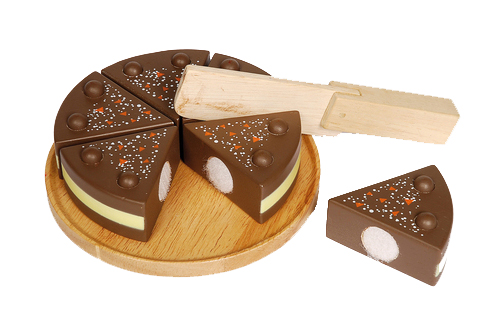 Съдържание / материал: Дървена торта от 6 парчета, дървен поднос, дървен нож. Отделните парчета на тортата са свързани с велкро – лесно могат да се отрежат с ножа и да се съединят отново.