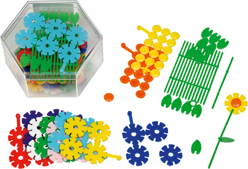 Съдържание / материали / размери: Детска игра конструктор, с която създавате фантастични цветя. Съдържа цветчета (Ø 2,7 см), стебла, листа и цветни пъпки от гъвкава пластмаса. Практична пластмасова кутийка с около 200 елемента.