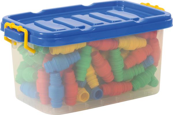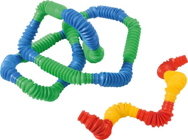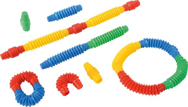 Комплект от гъвкави и сгъваеми цветни тръби в практична кутия. Ако наставите и удължите тръбите, ще чуете тракащ звук. Можете да създавате различни фигури като змии, кръгове и триизмерни форми. Отличен материал за стимулиране на детското въображение и изобретателност.