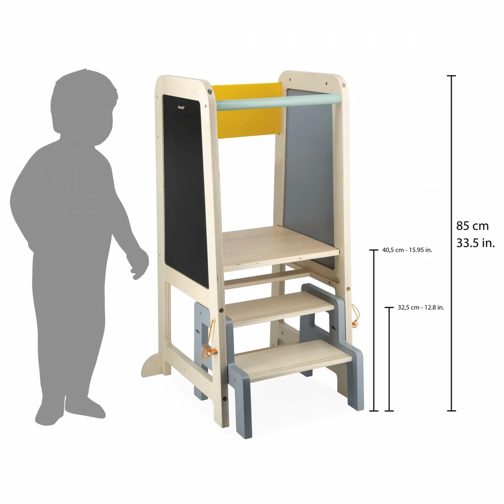 Тази ергономична и функционална детска кула е създадена, за да осигури на малчуганите независимост, сигурност и забавление по време на ежедневните занимания. Подходяща за деца над 18 месеца, тя е идеален помощник в кухнята, банята или при всякакви дейности, изискващи участие на детето.