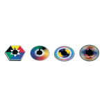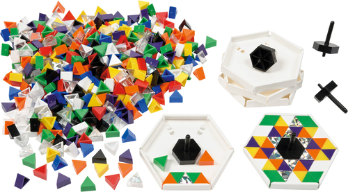 Съдържание / материали / размер: 5 рамки, 5 щифта за въртене, 400 триъгълничета в различни цветове, 100 блестящи триъгълничета. Найлонова опаковка.