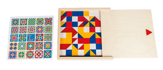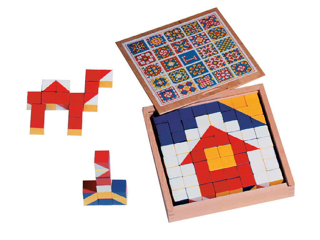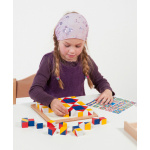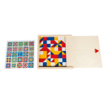 Съдържание/ материали / размери: 64 цветни дървени кубчета (2,4х2,4 см) в дървена кутия с плъзгащ се капак, 21,5х21,5х4 см.