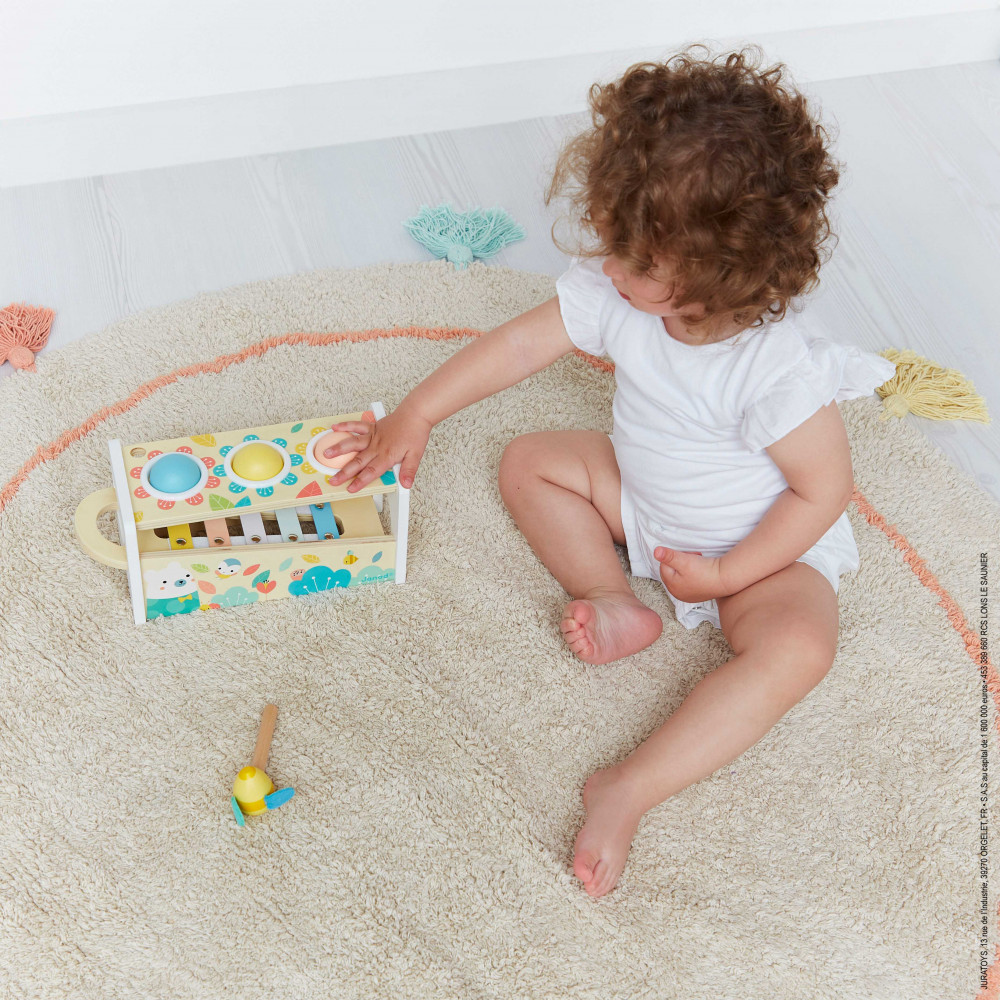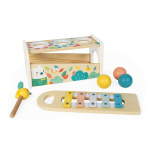 Тази цветна и забавна дървена образователна играчка 2 в 1 комбинира ксилофон и игра с чукче, като развива фината моторика, координацията и музикалния слух на вашето дете. Подходяща е за малки изследователи над 18 месеца.