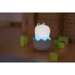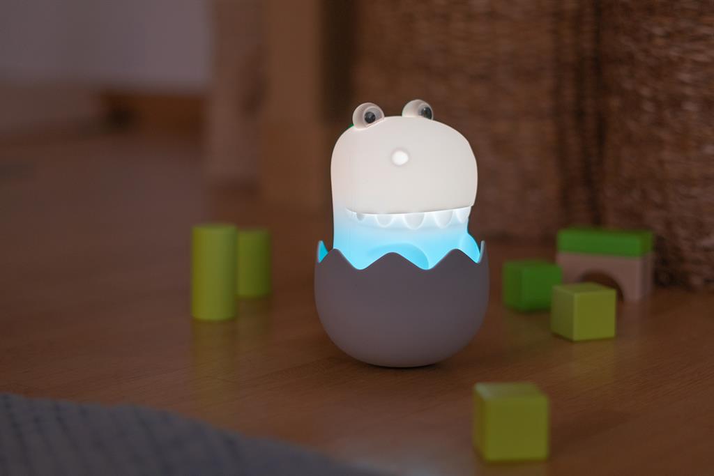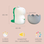 Лампичката свети в топла бяла светлина (3000K), а при докосване детето може да активира седем нежни цвята и забавни динозавърски звуци. Включен е и режим на тиха нощна светлина, който не пречи на съня. Подходяща е за деца от 18 месеца, без BPA, с 3 степени на яркост, лесна за хващане и напълно безопасна за държане в ръка, докато заспиват.