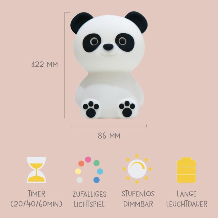 Със своята нежна усмивка и уютна светлина, детската нощна лампа PADDY PANDA се превръща в надежден пазител на съня и верен приятел на всяко дете. Излъчвайки топла бяла димираща светлина, тази мека силиконова лампичка осигурява успокояваща атмосфера, идеална за заспиване, четене на приказки или нощно кърмене.