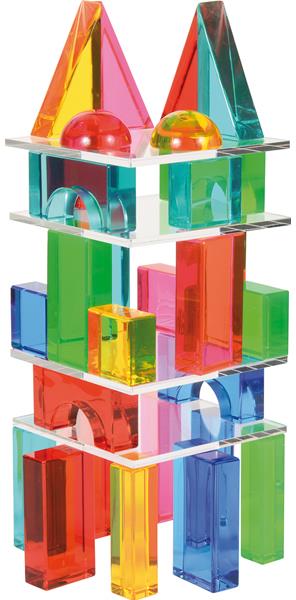 Този комплект включва 32 прозрачни стоителни блокчета в ярки цветове, които предлагат неограничени възможности за творческа игра и учене. Благодарение на атрактивната си лъскава повърхност и прозрачни отражения, децата могат да изграждат многоетажни структури, изследвайки различни форми, цветове и оптични ефекти.