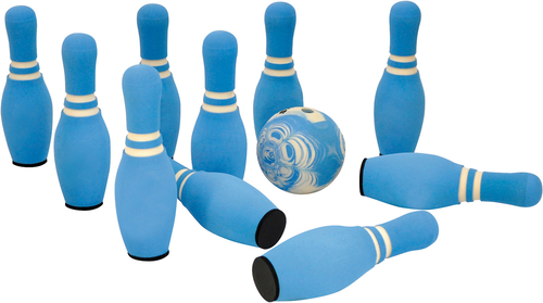 Комплект мек детски боулинг за игра вътре и отвън. Съдържание / материал: 10 конуса, 1 топка, изработени от EVA пяна, с триъгълен шаблон за игрално поле, в калъф Размери: конус Ø 11 см, височина 34 см, топка Ø 17,5 см