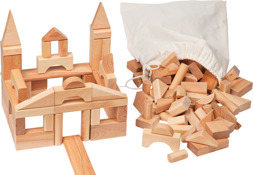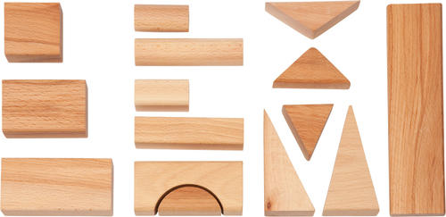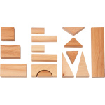 Съдържание/ материали / размери: 113 строителни блокчета в различни форми и размери. Голямо блокче: 10х5х2,5 см. Изработени от масивна букова дървесина, обработена с естествени масла.